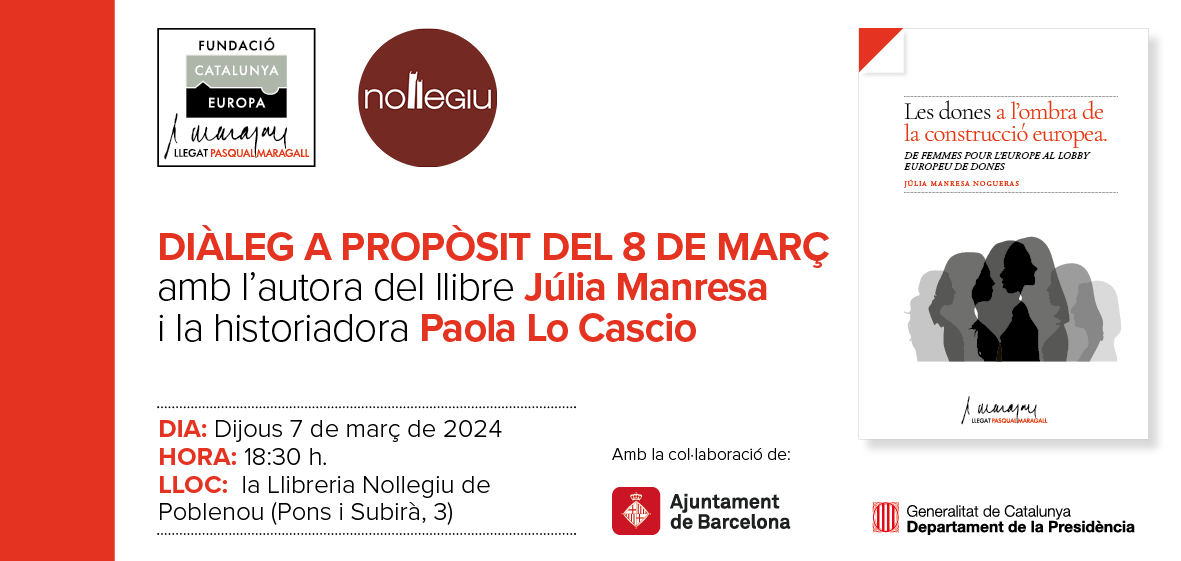 Diálogo con motivo del 8 de marzo con Júlia Manresa, autora del libro y premio Legado Pasqual Maragall 2023 "Las mujeres a la sombra de la construcción europea" y la historiadora Paola Lo Cascio.